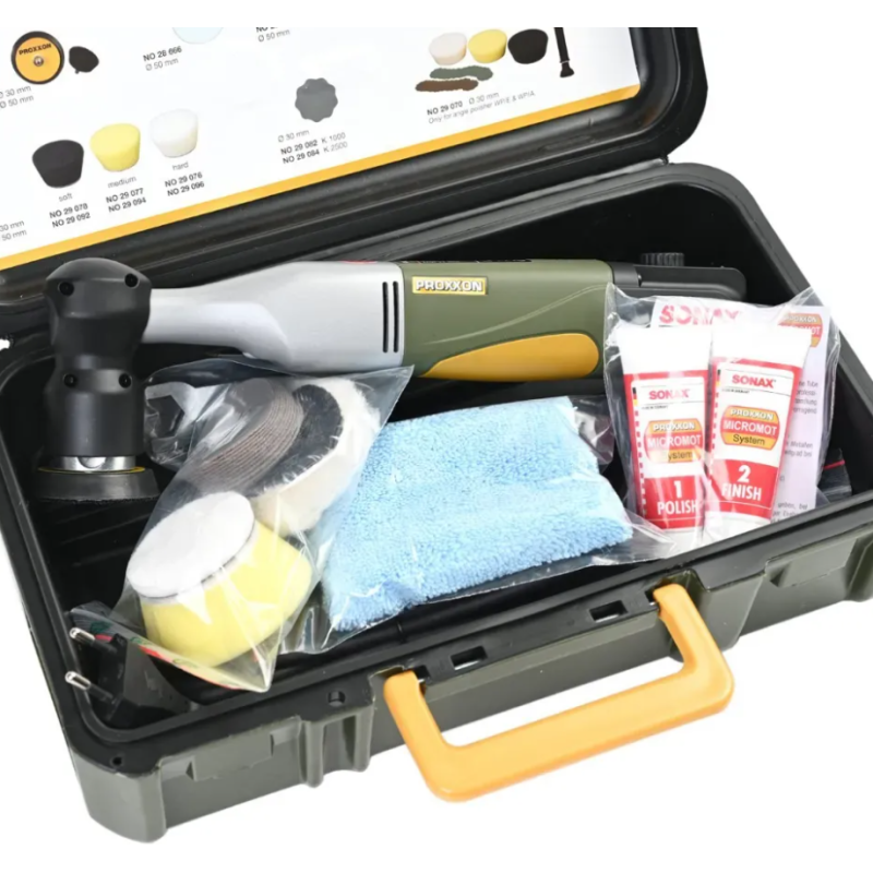Кутова орбітальна полірувальна машина EP/E 28680 фірми Proxxon - потужний професійний інструмент для чистової обробки поверхонь, чищення, видалення іржі та дрібних подряпин на лаковому покритті. Підходить для роботи в місцях з обмеженим простором.