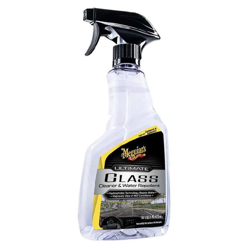 Ultimate Glass Cleaner & Water Repellent від Meguiar\'s - це новий засіб, що поєднує прекрасні очищувальні властивості з покращеним гідрофобом. Створює верхній шар для відштовхування води на склі, камерах допомоги водієві та датчиках. Цей удосконалений очисник для скла простий у використанні. Просто розпиліть засіб на поверхню секціями і опрацюйте поверхню за допомогою мікрофібри преміум-класу. Переверніть рушник, щоб відполірувати вікно чистою стороною. Ви отримаєте гладке, прозоре скло без розводів і помутнінь. Крім того, ви отримуєте додаткові переваги гідрофобної технології, яка допомагає воді збиратися у краплі та скочуватися зі скла. Це також допомагає покращити огляд в дощову погоду.