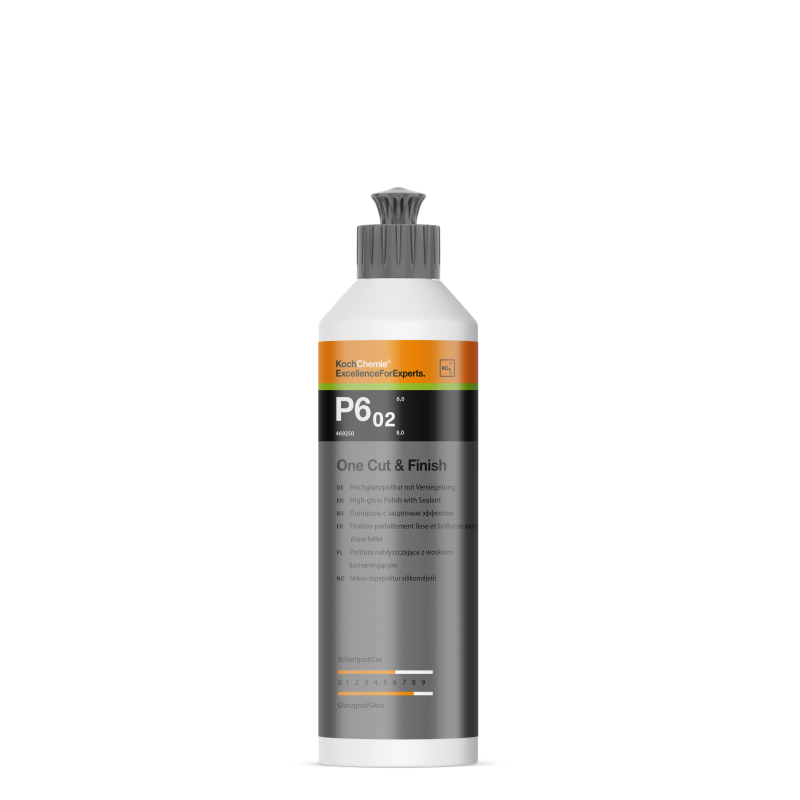 One Cut & Finish P6.02 – це інноваційний засіб для машинного полірування. Ця полірувальна паста має середній ступінь абразивності – 6, ступінь блиску близько до максимального – 8. Швидко надає поверхні ЛКП дзеркальний блиск, ефективно видаляє неглибокі подряпини та сліди дрібнозернистого полірування (з гритністю P 2000). Забезпечує захист поверхні завдяки воску карнауби, що входить до складу пасти. Ця паста ідеально підходить для м'яких ЛКП. Щільність: 1,07 (1000 мл – 1070 г, 250 мл – 267,5 г). Рекомендації щодо застосування: Використовувати помаранчеве полірувальне коло One Cut. Поступово розподілити по поверхні ЛКП і відполірувати за допомогою ексцентрикової полірувальної машинки. Швидкість обертання – середня. УВАГА - інформація про товар має винятково довідковий характер. Притягнення нашої компанії до відповідальності на основі цієї інформації виключено. Ви самі повинні перевірити придатність для конкретного застосування. Професійні засоби вимагають відповідних навичок, а ми завжди готові проконсультувати Вас.