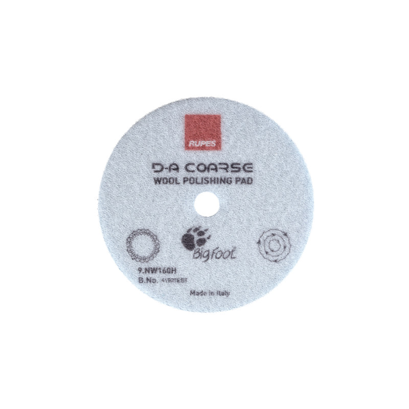 RUPES D-A Coarse Wool Polishing Pad NW160H – полірувальний круг із жорсткої шерсті, розроблений для роботи сумісно з ексцентриковими полірувальними машинами. Допускається використання із планетарними пристроями. Підходить для швидкого та ефективного усунення грубих дефектів лакофарбового покриття та слідів матування, у тому числі твердих лаків. Найкращі результати показує з полірувальними пастами RUPES D-A Coarse, RUPES D-A Fine. У деяких випадках, у поєднанні з пастою RUPES Uno Protect, може використовуватися для однокрокового полірування.