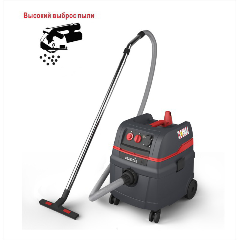 Starmix ISC Compact ARDL - 1625 EWS - Промисловий пилосос 016467 Промисловий пилосос для збору пилу і води при паралельній роботі з електроінструментом. Розроблений спеціально для тривалого безперервного професійного використання практично у всіх існуючих сферах використання. Унікальна функція електромагнітної імпульсної віброочистки фільтрів (включається автоматично під час перерв в роботі). Може працювати без мішка. Розeтка для підключення електроінструменту з функцією синхронізації включення і відключення. Система плавного пуску і зупинки. Плавне регулювання потужності. Індикатор падіння повітряного потоку при засміченні фільтра. Датчик рівня води (сенсор) з автоматичним відключенням. Збільшений майданчик для інструменту. Всередині контейнера є поворотна заслінка для раціонального використання паперового або поліетиленового мішка для сміття. Пилосос оснащений зручним місцем для зберігання шланга і шнура. Компактна сучасна конструкція. Простоте очищення контейнера. Завдяки спеціальному гачку і стрічці-липучці є можливість фіксування шнура і шланга. Модернізована і запатентована технологія фільтрів. Контейнер має подвійні стінки, а також він удароміцний і стійкий. Сучасний дизайн. Висока мобільність за рахунок зручних передніх і задніх коліс. У комплект поставки входить два касетних фільтра (площа поверхні, що фільтрує 8600 см2)
