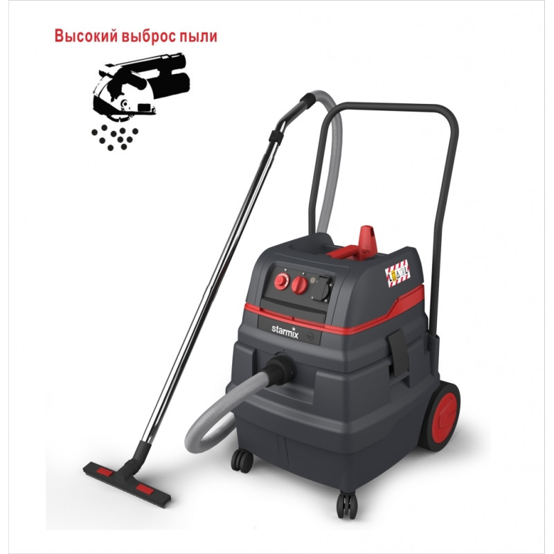 Starmix ISC Compact ARDL - 1650 EWS - Промисловий пилосос 016474 Промисловий пилосос для збору пилу і води при паралельній роботі з електроінструментом. Розроблений спеціально для тривалого безперервного професійного використання практично у всіх існуючих сферах використання. Унікальна функція електромагнітної імпульсної віброочистки фільтрів (включається автоматично під час перерв в роботі). Може працювати без мішка. Розeтка для підключення електроінструменту з функцією синхронізації включення і відключення. Система плавного пуску і зупинки. Плавне регулювання потужності. Індикатор падіння повітряного потоку при засміченні фільтра. Датчик рівня води (сенсор) з автоматичним відключенням. Збільшений майданчик для інструменту. Всередині контейнера є поворотна заслінка для раціонального використання паперового або поліетиленового мішка для сміття. Пилосос оснащений зручним місцем для зберігання шланга і шнура. Компактна сучасна конструкція. Простота очищення контейнера. Завдяки спеціальному гачку і стрічці-липучці є можливість фіксування шнура і шланга. Модернізована і запатентована технологія фільтрів. Контейнер має подвійні стінки, а також він удароміцний і стійкий. Сучасний дизайн. Висока мобільність за рахунок зручних коліс і ручки. Додатковою опцією є комплектація пилососа контейнером об'ємом 50 л. У комплект поставки входить два касетних фільтра (площа поверхні, що фільтрує 8600 см2)