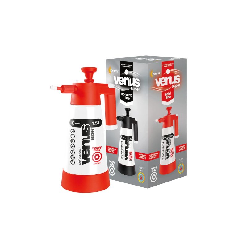 Кислотостійкий ручний розпилювач КВАЗАР | KWAZAR Venus Super HEAVY DUTY acid line - обприскувач із підвищеною хімічною стійкістю, призначений для кислотних препаратів, що використовуються у будь-яких сферах діяльності. Кислотостійкий розпилювач Venus Super HEAVY DUTY acid line для кислоти має вайтові ущільнення та конструкція насоса гарантують їхню довгу працездатність. На баку ручного розпилювача для кислот знаходиться чітка шкала ємності та прозора смужка, що вказує на рівень рідини.