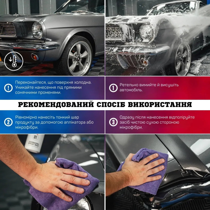 Нова формула рідкого карнаубського воску. Використовуємі воскові та силіконові емульсії забезпечують задоволення від нанесення, відмінні водовідштовхуючі властивості та високу витривалість. Залишає поверхню надзвичайно гладкою, додає глибини кольору та блиску.