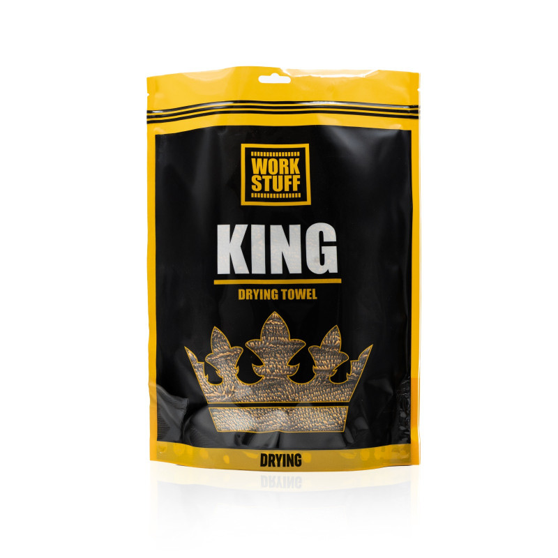 Work Stuff KING Drying Towel – великий двосторонній рушник з мікрофібри для швидкої та ефективної сушки кузова. Його особливість – структура волокон «Twisted Pile». Вони скручені між собою для створення щільної текстури. Вона ж дозволяє вбирати та утримувати велику кількість вологи, бруду та залишків автохімії. Також скручені волокна наділяють рушник довговічністю, оскільки вони менше схильні до пошкоджень та деформацій навіть після багаторазових прань.