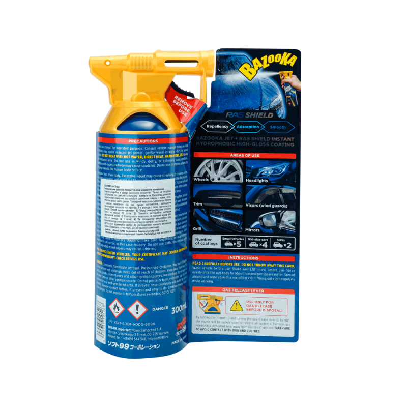 Аерозоль Bazooka – інновація у сфері захисних покриттів. Тепер не потрібно турбуватися про сумісність кольору та матеріалів. Rain Drop – це універсальний захист, яким можна покрити одразу всі поверхні автомобіля: кузов, скло, диски, а також пластикові та хромовані елементи. Тригер на балоні забезпечує простоту та високу швидкість нанесення під час сушіння авто. Термін дії захисту на лакофарбовому покритті – 3 місяці, на склі – 2 місяці.